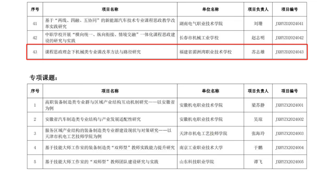 近日,机械工业教育发展中心公布2024年度机械行业职业教育“产科教协同创新”课题项目立项名单,我系苏志雄老师的课题《课程思政理念下机械类专业课改革方法与路径研究》成功入选。