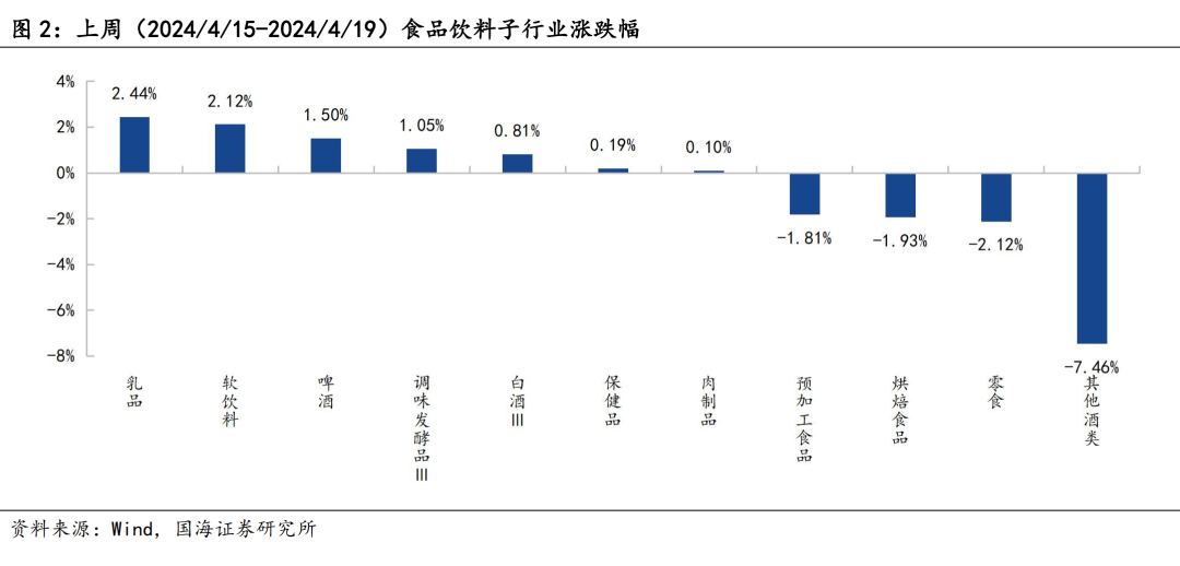 1、大盘整体上涨,食品饮料板块回暖。上周(2024/4/15-2024/4/19)一级行业中食品饮料涨幅0.74%,跑输上证综指(+1.52%)0.78个百分点。各细分行业中乳品涨幅最大,上涨2.44%,其次涨幅较大的是软饮料和啤酒,涨幅分别为2.12%和1.50%。个股方面,承德露露(+9.57%)、张裕A(+9.02%)、西麦食品(+7.19%)、香飘飘(+6.39%)、珠江啤酒(+5.66%)等领涨。