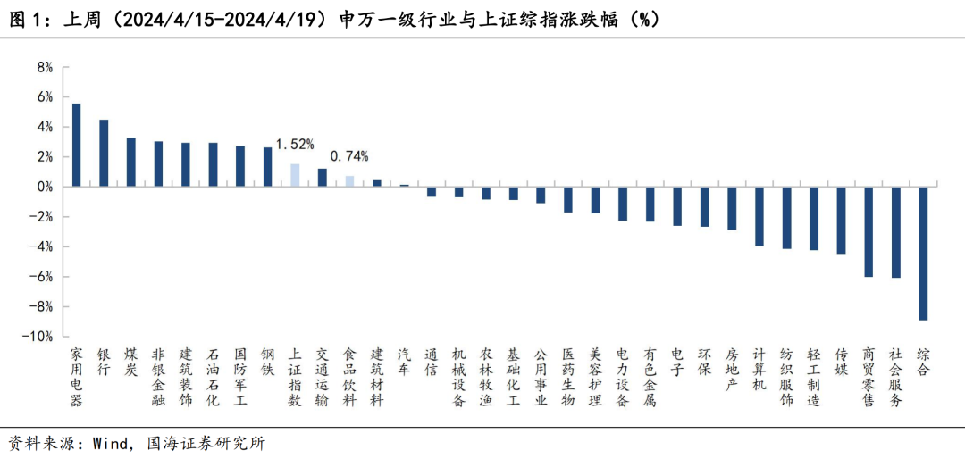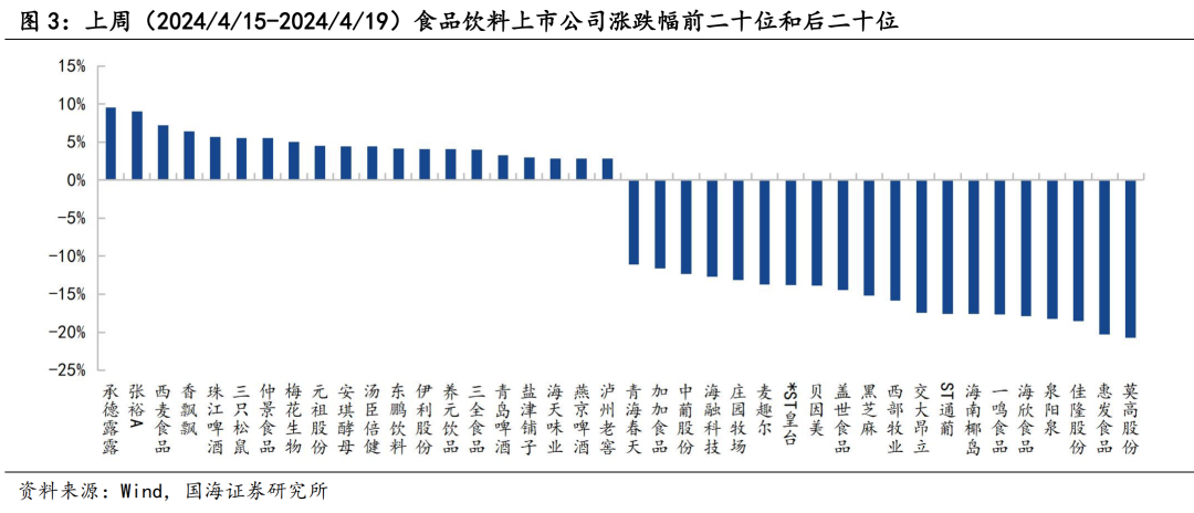 2、白酒:龙头业绩确定性强,下周即将迎来业绩密集期。上周(2024/4/15-2024/4/19)前半周,由于国九条发布,板块内以白酒为代表的业绩稳健的龙头公司涨幅较为明显。另外根据上周发布的社零数据,3月烟酒类产品的零售额同比增长9.4%,在去年不低的基数上继续保持高增,明显高于社零总体增速(3.1%),在所有社零品类中增速排名靠前。体现了烟酒类产品在整体宏观需求疲软的背景下穿越周期的能力。由于最近属于白酒行业的消费淡季,市场只能关注茅五批价的边际变化。上周散花飞天的批价波动又引起市场关注。实际上散花飞天门店到货量非常有限,终端稀缺性仍将持续。由于散花飞天是今年年初发布的茅台文化产品,首批出货量少,市场第一波尝鲜价畸高,目前来看销量占比也非常有限,媒体的过度关注和炒作放大了市场的恐慌,并不会影响普通飞天茅台的供需关系。下周即将迎来年报和一季报的密集发布期,龙头公司或将彰显业绩确定性和分红能力,板块将迎来催化。重点推荐:贵州茅台、山西汾酒、今世缘、泸州老窖、五粮液、古井贡酒、迎驾贡酒、金徽酒等。