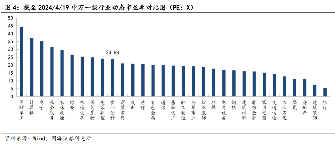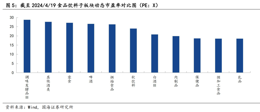 估值方面,截至4月19日食品饮料板块动态市盈率为23.88x,位于一级行业上游位置。食品饮料子板块中,上周(2024/4/15-2024/4/19)调味发酵品Ⅲ(28.78x)估值排名第一,其他酒类(27.63x)、零食(27.14x)位列第二、三名,保健品(18.64x)、预加工食品(18.55x)、乳品(18.52x)估值分列最后三位。