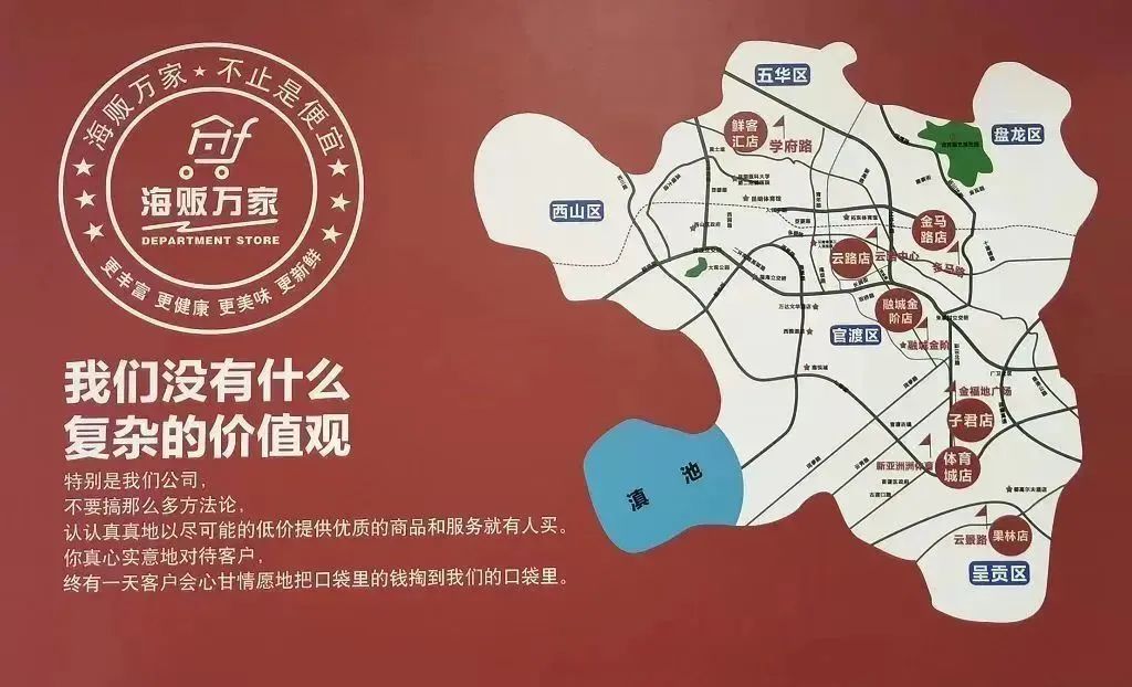 海贩万家生活超市。成立于2016年,致力于发展1000-3000平方米社区生活超市,辐射半径0.5公里,步行时间20分钟以内。就近购买原则,满足一站式购物。目前在昆明开有8家门店:果林店、子君店、金马店、学府路店、新亚洲店、云路中心店、融城金阶店、篆街店。为社会提供了400多个就业岗位。