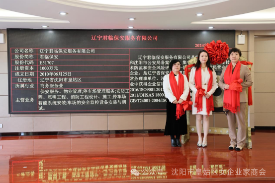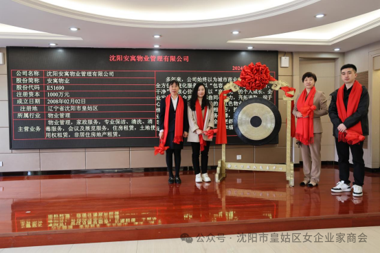 会上进行了鸣锣仪式,我商会副会长单位沈阳依神服装有限公司、大疆山川(辽宁)建筑有限公司、辽宁文旅传媒集团有限公司、辽宁君临保安服务有限公司,理事单位科大智谷(沈阳)科技服务有限公司,会员单位沈阳安寓物业管理有限公司负责人依次在皇姑区人大常委会副主任、皇姑区工商业联合会主席时洪,皇姑区政府副区长陈丹,皇姑区金融发展局党组成员、副局长孙成员的陪伴下鸣锣,这象征着皇姑区企业在金融资本的赋能下,将迎来更加广阔的发展空间和更加美好的未来。