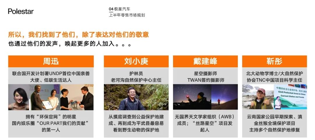 在代言人选择上,增加了陈坤我认为加分的!他们对待生活和工作的态度,与极星的“环保”、“可持续”等理念相辅相成,是最具代表性的“摘星人”(备注:我们在方案里提的是“摘星者”)。