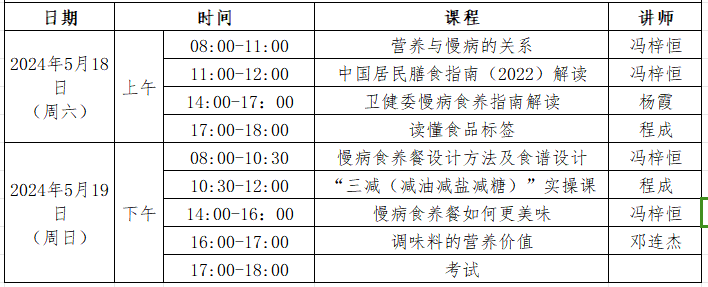 1. 培训时间共计2天,拟定5月第三周暨全民营养周周末(5月18日-19日);
