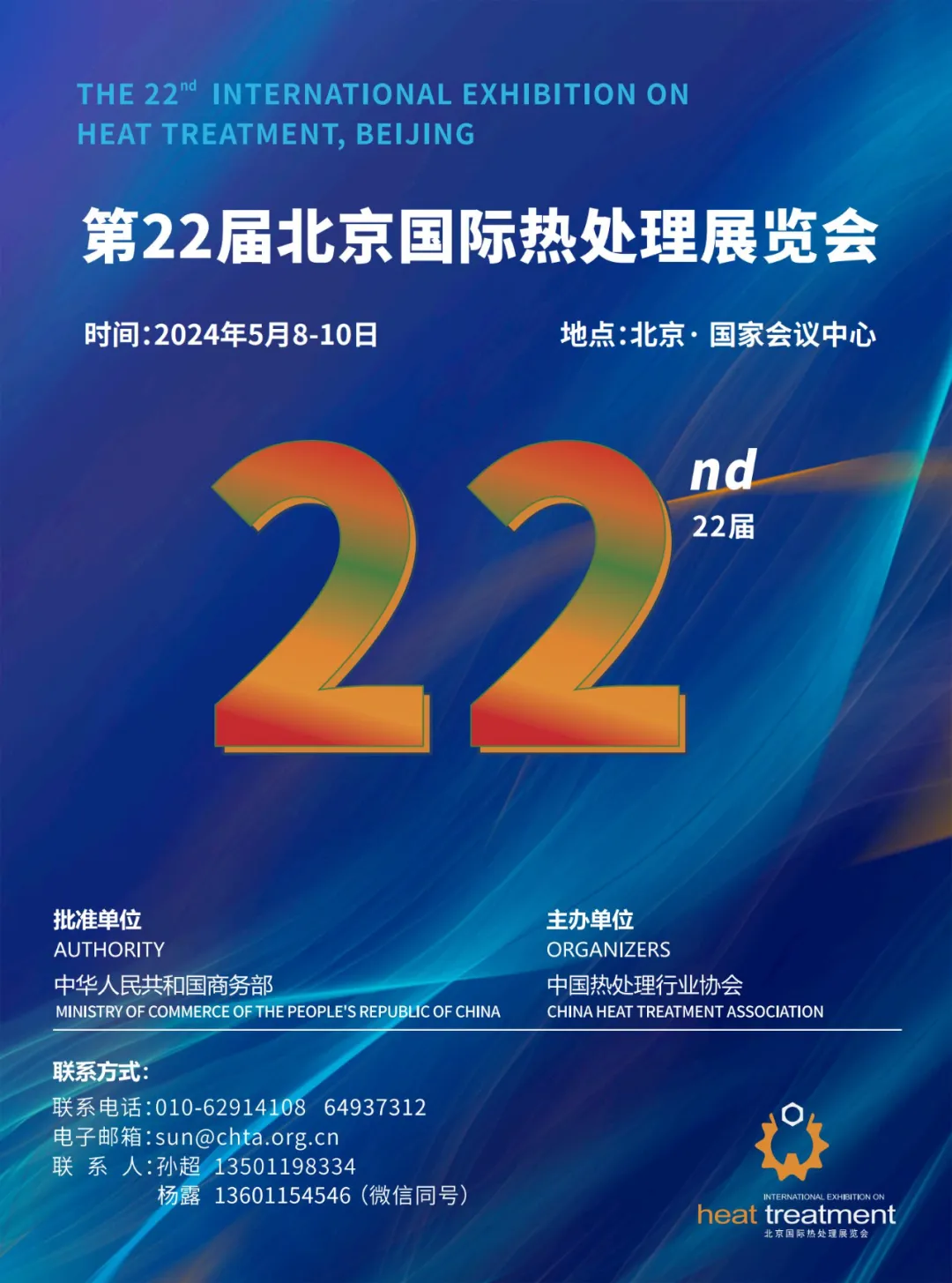 由中国热处理行业协会主办的“第22届北京国际热处理展览会” 将于2024年5月8~10日在北京国家会议中心举办。