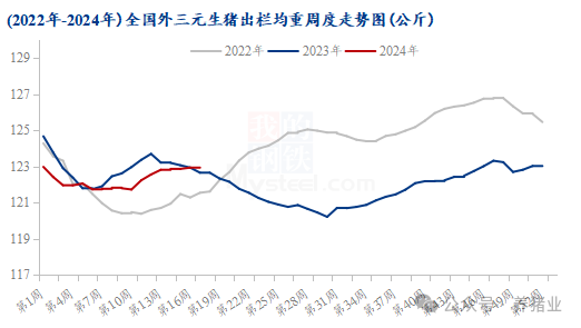 从中大猪存栏量看,3月末全国规模场中大猪存栏量同比下降3%。中大猪存栏对应2个月内的生猪出栏量,这预示着二季度的生猪上市量将有所减少,尽管整体存栏降幅有限,但不可忽视的是今年一季度出栏均重同比亦有所下降,据Mysteel农产品数据统计,截止到4月25日当周全国外三元出栏均重为122.94公斤,一季度出栏均重为122.14公斤,环比下降0.48%,同比下降0.61%。虽说整体下降幅度亦较为有限,但量质齐齐下降对终端猪肉供给压力缓解作用或起到“1+1>2”效果。