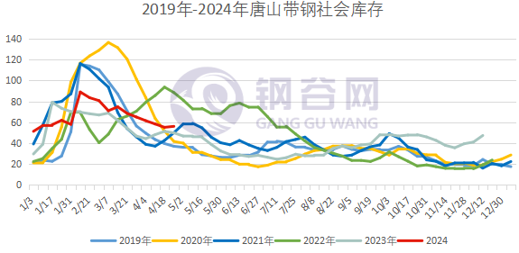 本周唐山带钢库存小幅增加,其中同比2023年增加6.23万吨,增幅12.49%;同比2022年减少32.36万吨,降幅36.58%;同比2021年增加6.10万吨,增幅12.20%;同比2020年增加14.46万吨,增幅34.73%;同比2019年增加19.09万吨,增幅51.58%。