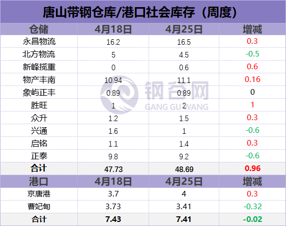 仓储总库存48.69万吨,占总库存的86.79%,较上周增加0.96万吨,增幅2.01%,永昌库较上周增加0.30万吨至16.50万吨;物产丰南库较上周增加0.16万吨至11.1万吨。