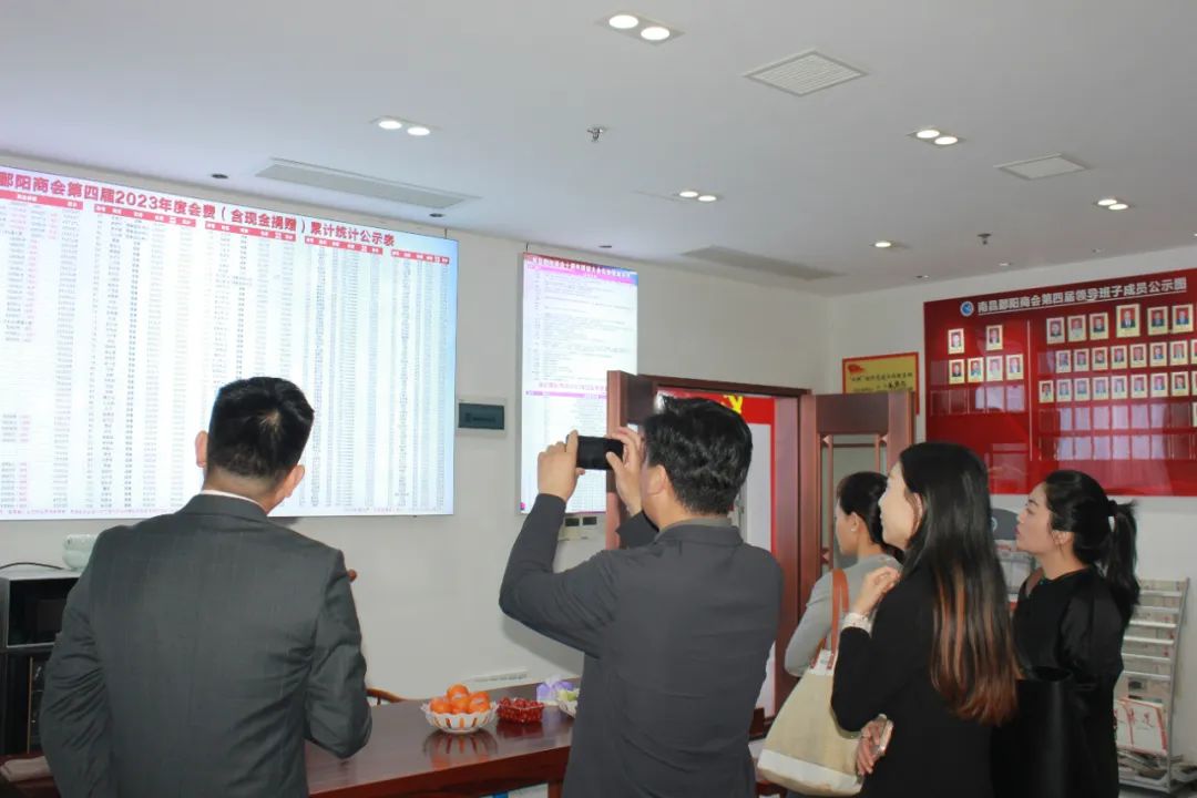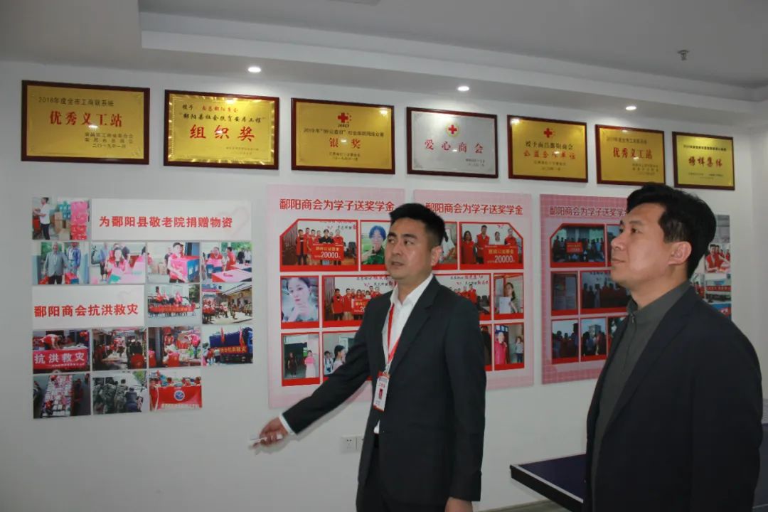 随后,来访客人一行乘电梯,来到鄱商大厦17层商会的办公区,陆续参观了鄱阳湖形象墙、鄱商交流中心及“胜平工作室”、鄱商之家、商会秘书处、商会荣誉室、商会慈善义工站、商会工会、商会健身中心和“四好商会”展示墙。