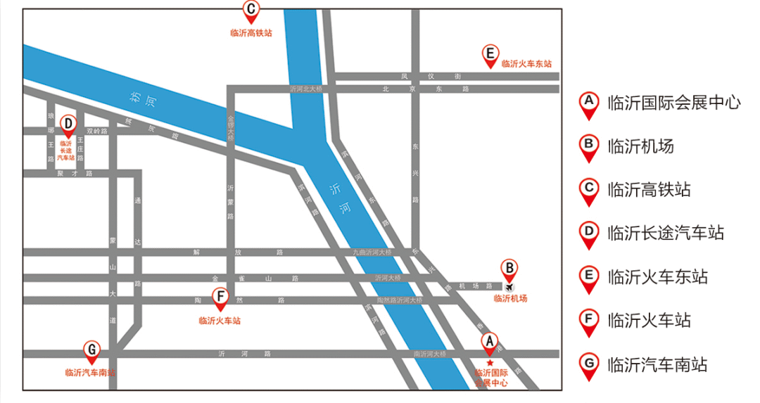 公交:K81路→临沂运输枢纽信息中心→公交K33路→东方城站→步行400米到达临沂国际会展中心。