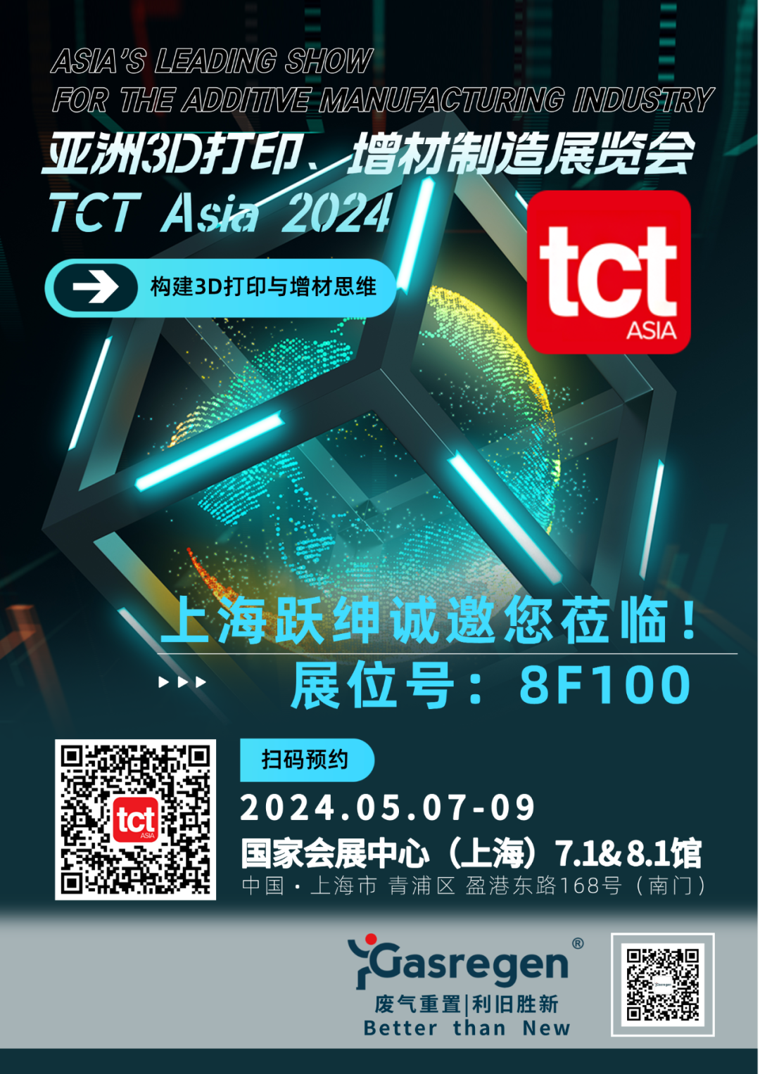 2024年5月07日-09日,亚洲3D打印、增材制造展览会TCT Asia 2024即将开幕,上海跃绅诚邀您莅临,期待与您在充满生机与活力的五月相遇,携手共赢,蓬勃发展!