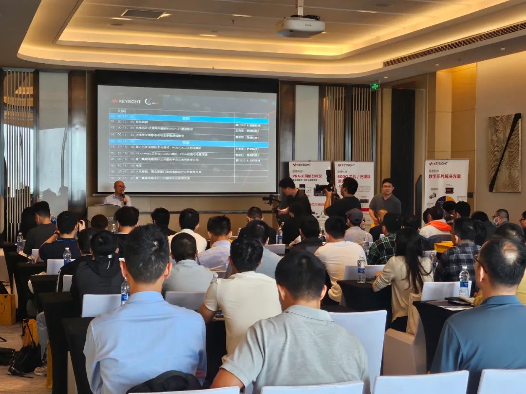 研讨会由是德科技中国区IC行业经理阳任平台主持,厦门集成电路设计公共服务平台主任、厦门市集成电路行业协会秘书长黄建宝致辞,本次活动邀请了是德科技多位资深技术专家分别做了《光电芯片/光模块与最新800G/1.6T测试挑战》《算力芯片关键技术与测试,PCIe/CXL/以太网测试》《RFIC/MMIC芯片On-wafer测试,Filter封装与电缆测试》等主题分享。专家们结合芯片测试中会遇到的典型问题,与参会者一起探讨如何提高测试效率和可靠性。研讨会现场气氛热烈、亮点纷呈,参会者积极参与互动环节,与专家们进行深入交流。