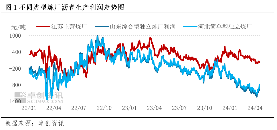 由于原油价格整体仍维持在高位波动,各类型炼厂的沥青生产利润本周虽有所修复,但整体仍处于深度亏损的状态。截至2024年4月17日,江苏主营炼厂沥青生产理论综合利润均值为22.45元/吨,同比下降了235.78元/吨;山东综合型独立炼厂为-1006.67元/吨,同比下降了737.94元/吨;河北简单型独立炼厂为-932.80元/吨,同比下降了700.08元/吨。