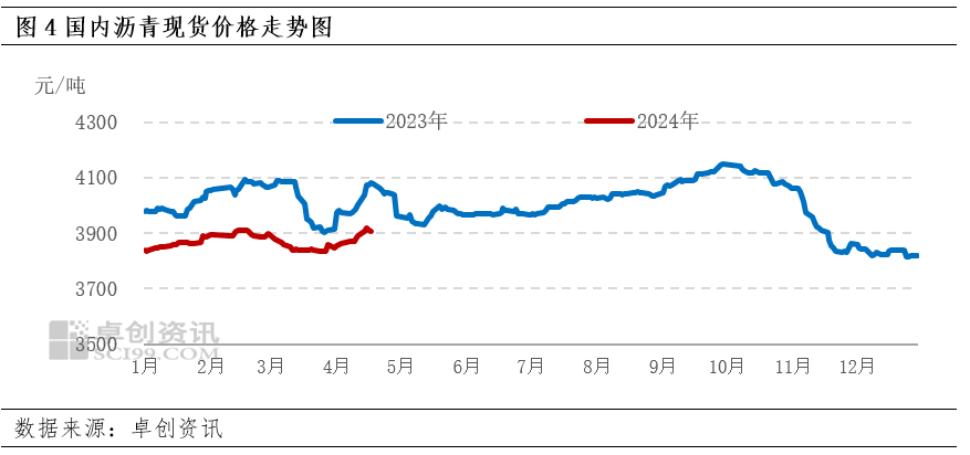 综合来看,尽管当前沥青成本端的支撑仍然较为稳固,但由于需求增速明显放缓,库存持续增加,沥青产量恢复不及预期带来的供应端利好相对有限,对价格也难以形成有力的支撑,需求偏弱仍是限制沥青现货价格上涨的最大利空因素。截至4月18日当周,沥青周度现货均价约为3905.71元/吨,同比大概下跌了163.29元/吨,下跌幅度为4.01%。并且,从波动幅度来分析,虽然原油在4月份仍维持高位波动,但沥青价格波动幅度约为70元/吨,波动幅度明显受限。
