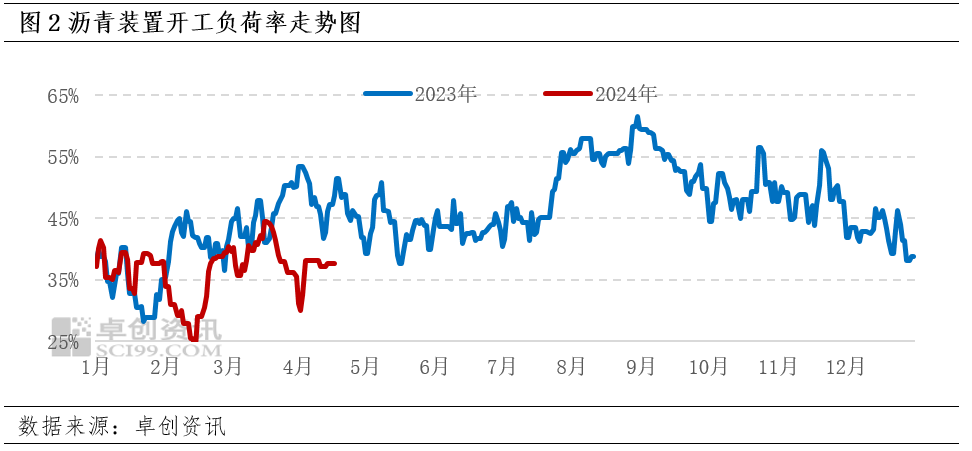截至4月17日当周,全国沥青装置周度平均开工负荷率为37.46%,环比下跌了0.65个百分点,周度沥青装置开工负荷率环比稳中下降。并且与2023年4月中期相比较,同比下跌了8.12个百分点,开工率恢复情况远不如往年同期水平。因此,从生产端来看,沥青目前供应的压力是相对有限的。