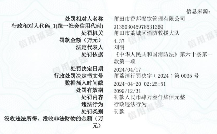 莆田市香邦餐饮管理有限公司,因行政违法行为,莆田市荔城区消防救援大队依据《中华人民共和国消防法》第六十条第一款第一项,对其处罚款人民币肆万叁仟柒佰元整。