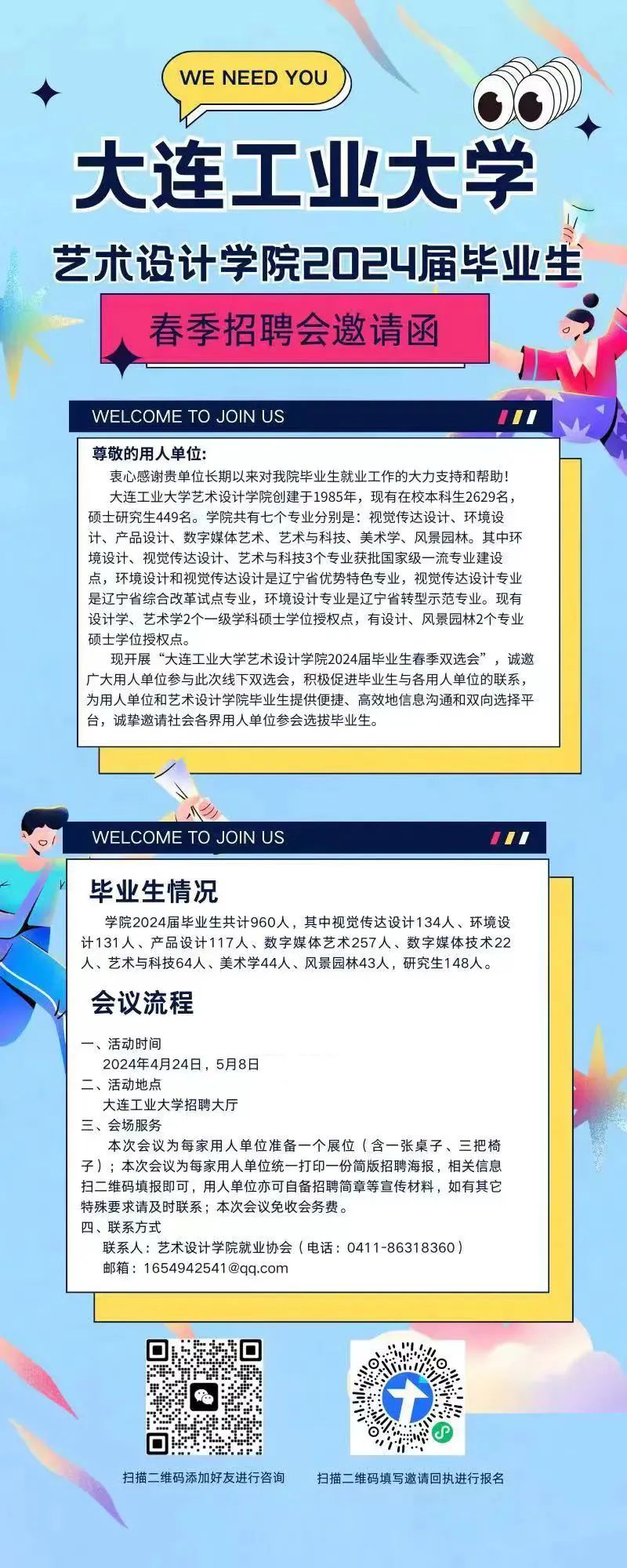 为满足广大建筑装饰行业企业对各类专业人才的需求,充分搭建高校和用人单位交流沟通平台,促进2024届毕业生高质量充分就业,大连市建筑装饰行业协会将联合大连工业大学艺术设计学院、大连海洋大学土木工程学院举办相关专业2024届毕业生春季就业双选会活动,现诚邀行业企业积极报名,本次活动不收取任何费用。 1、大连工业大学艺术学院2024届毕业生春季招聘会时间:2024年4月24日、5月8日 14:00-16:00 2、大连海洋大学2024届土木建筑类毕业生春季就业双选洽谈会时间:2024年5月10日 13:30-16:30 本次校园招聘活动邀请我市行业建筑装饰行业国央企、大型建设集团、行业建安企业、材料生产销售企业、设计机构以及有建筑装饰行业相关专业招聘需求的有关单位,组织有意向的企业共同参与招聘。 1、请报名的用人单位于2024年4月22日15:00前下载填写《2024年高校校园招聘活动用人单位信息反馈表》反馈协会秘书处,登记岗位需求信息。 2、请用人单位派专人扫码加入招聘活动用人单位联络咨询群,与高校有关负责人进一步后续对接具体参会注意事项,并及时关注有关后续通知。 3、会务组将对所收集的企业相关信息仅作本次招聘会使用,望积极配合,如实填写。 1、招聘的职位信息请避免使用“几年工作经验”或“有工作经验优先”等要求。 2、为规范校园招聘秩序,将根据报名回执安排展位,凡预定展位的单位请务必按时前往招聘会地点,因故不能参加的单位,请最晚于招聘会前一天告知。 3、用人单位招聘展板等由高校按照报名信息统一制作,不收取用人单位费用,用人单位务必准确填写,若有变动,请尽快与高校联系确认。 2、后续协会继续通过相关平台免费发布用人单位招聘信息; 4、如有其他要求和建议,请联系协会秘书处。感谢您的信任和支持!