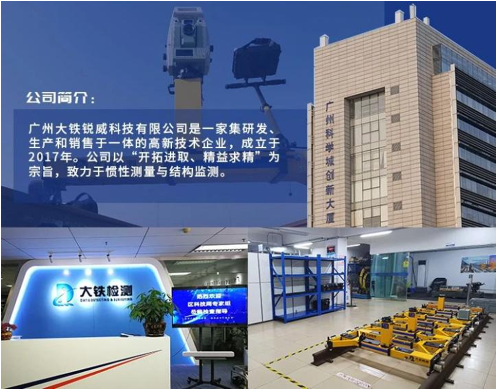 广州大铁锐威科技有限公司(简称“大铁检测”)坐落于美丽的广州科学城,注册资金2000万,公司荣获乙级测绘资质、数十项专利与软著、高新技术产品、ISO体系认证、国家高新技术企业、广东省专精特新中小企业、广东省瞪羚培育企业、广州市“专精特新”民营企业扶优计划培育企业等称号、3A信用等级企业等多项认证证书,是一家集研发、生产、销售及服务于一体的科技型公司。相继在成都、常州等地成立分公司。大铁检测以“开拓进取、精益求精,致力于惯性测量与结构监测”为企业目标,是一家充满活力、注重科技与用户体验的公司。