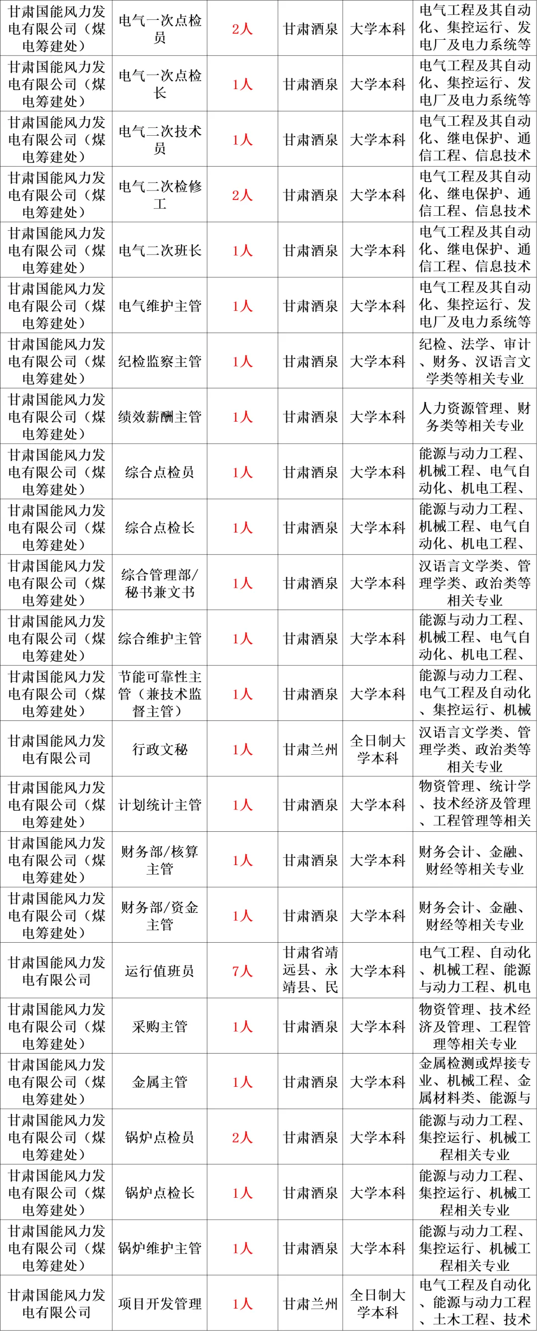 本次招聘单位为甘肃公司本部、甘肃国能风力发电有限公司(以下简称国能风电公司)、国能达拉河水电开发有限公司(以下简称达拉河公司)、巴丹吉林沙漠基地外送电项目筹建处,因本部管理提升及项目建设需要,在集团公司系统内招聘管理人员、技术人员、运行值班等技能操作人员。