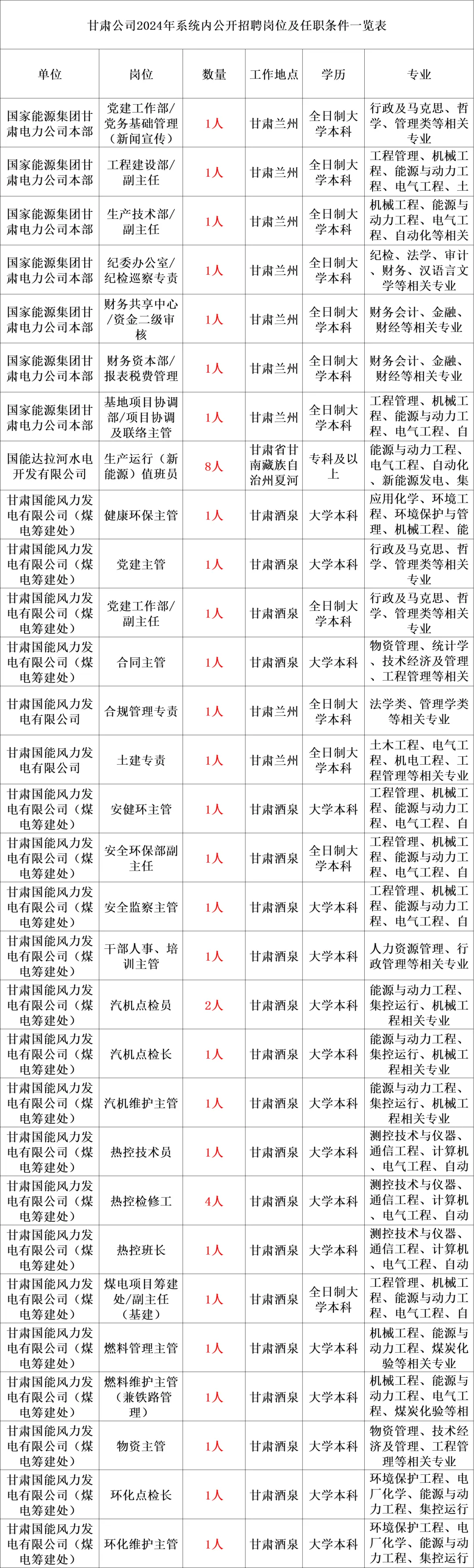 为全面落实集团公司“136”发展战略,保障国家能源集团甘肃电力有限公司(以下简称甘肃公司)业务发展需要,优化人力资源配置结构,按照集团公司《国家能源集团员工招聘、调配和退出管理办法》《关于下达2024年系统内招聘和劳务工新增计划的通知》有关规定及要求,结合甘肃公司实际,拟在国家能源集团系统范围内招聘相关专业人员74名点击获取职位表,现将有关事项公告如下。