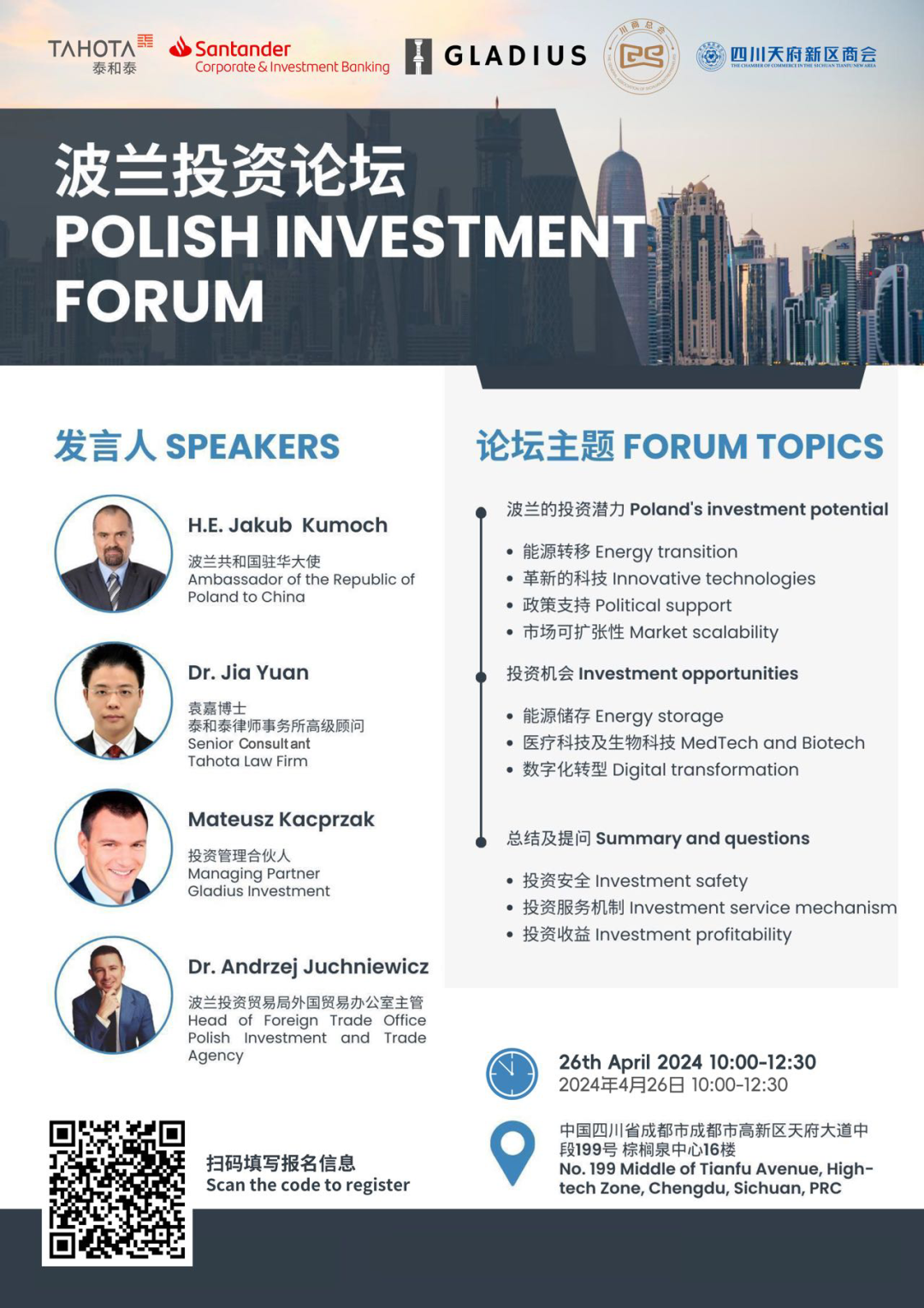 波兰投资论坛(POLISH INVESTMENT FORUM)活动将于2024年4月26日举行,此次活动由四川天府新区商会与副会长单位泰和泰律师事务所共同协办,我们诚邀您的参与,并共同探讨波兰的投资机遇,深化中波两国的经济合作。