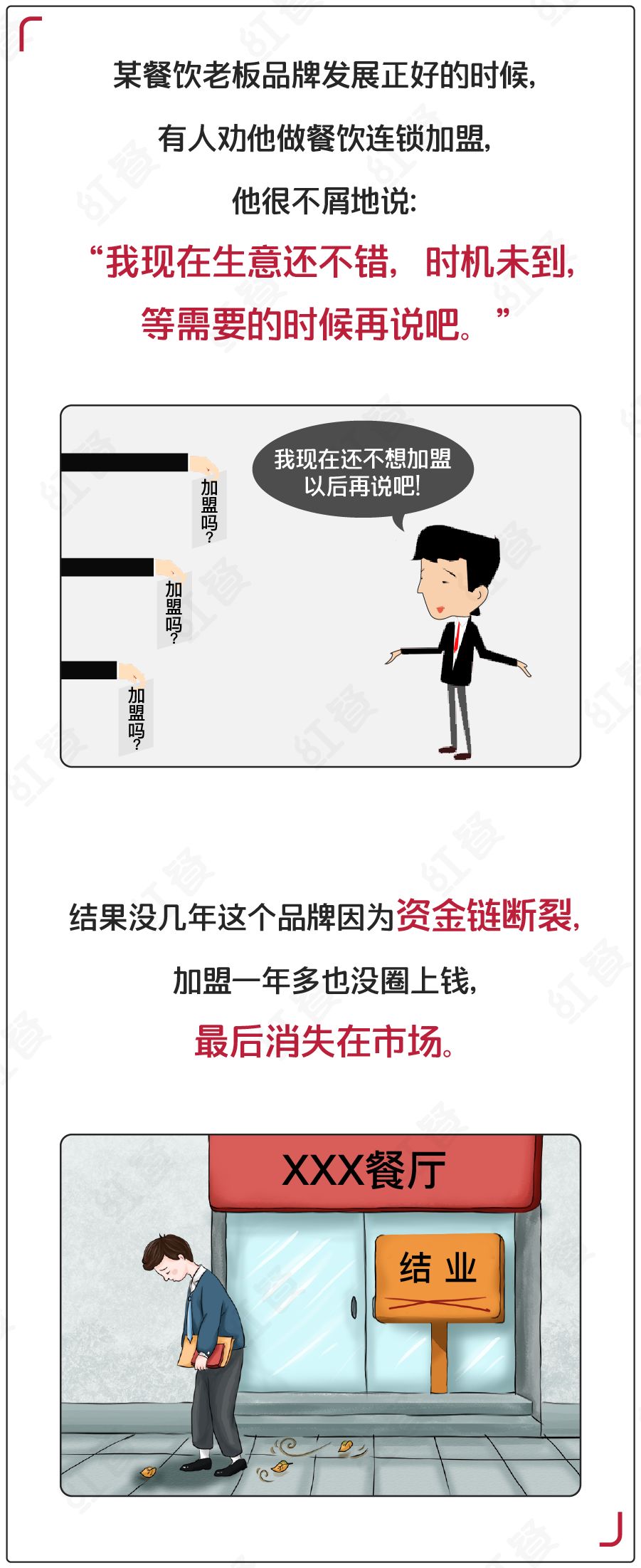 在挣钱的时候不开放加盟,等你缺钱的时候已经晚了。加盟不是为了赚钱,而是为了品牌发展多线均衡,抗击未来的致命风险。