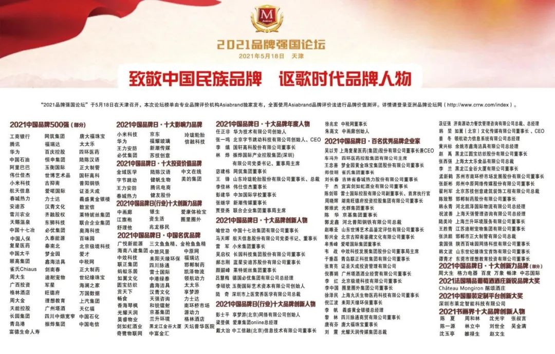 5月18日,为庆祝第五个“中国品牌日”,积极贯彻国家品牌强国战略,促进中国经济全面复苏和高质量发展,提升中国品牌国际影响力和竞争力。由专业品牌评价机构Asiabrand发起,并联合中国亚洲经济发展协会、《环球时报》社和亚洲品牌网联合举办的“2021品牌强国论坛”第二期活动作为2021亚洲品牌论坛的重要组成部分,在天津隆重举行。公司“秦南北”品牌荣登“2021年中国品牌500强”榜单。
