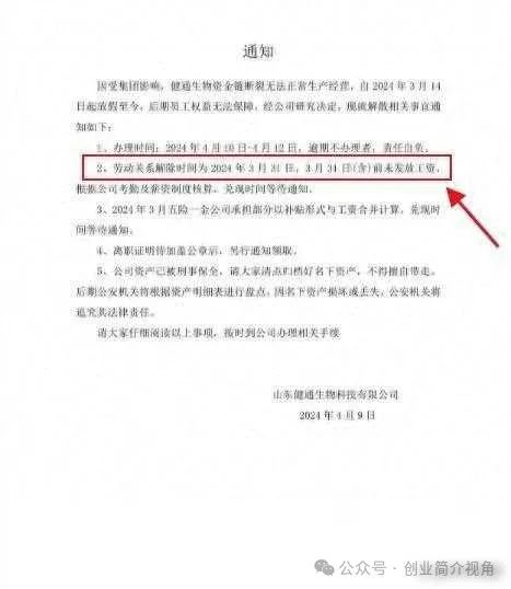 据公司内部通知显示,受集团影响,健通生物科技有限公司资金链断裂,无法正常经营,员工权益也无法得到保障。因此,公司管理层决定即日起解散公司,员工被解除劳动合同。这一消息对于员工们来说无疑是一个沉重的打击,他们失去了稳定的工作和收入来源,未来充满了不确定性。