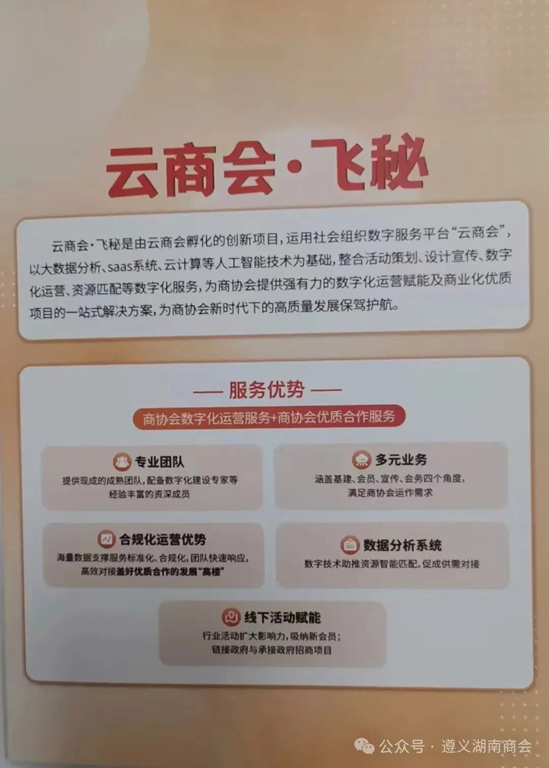 云商会·飞秘是由云商会孵化的创新项目,运用社会组织数字服务平台“云商会”,以大数据分析、SaaS系统、云计算等人工智能技术为基础,整合活动策划、设计宣传、数字化运营、资源匹配等数字化服务,为商协会提供强有力的数字化运营赋能及商业化优质项目的一站式解决方案,为商协会新时代下的高质量发展保驾护航。