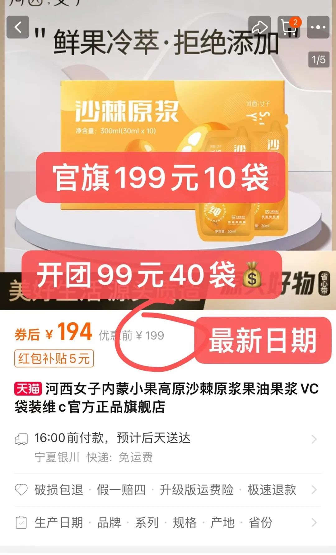 品牌直发!闪团一周❗官旗199元/10袋?本团99元/40袋秒杀【河西女子·100%沙棘原浆】❗