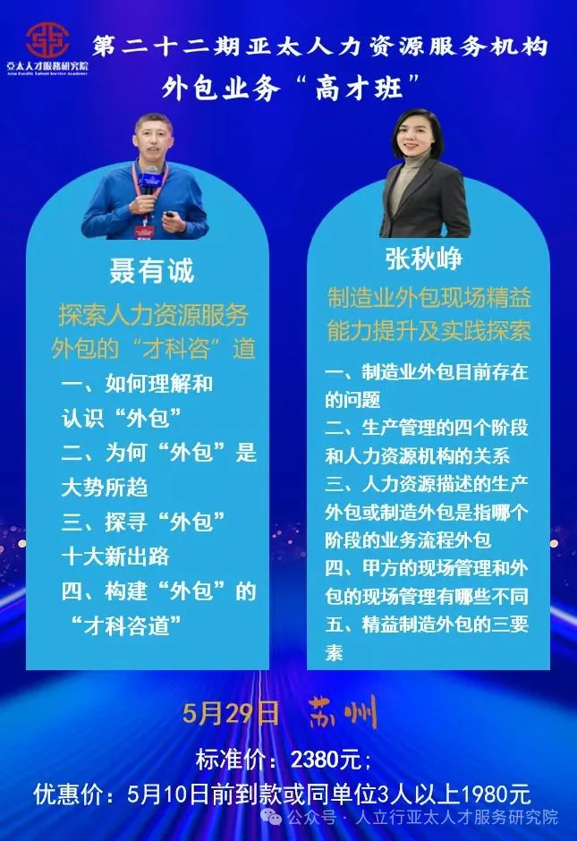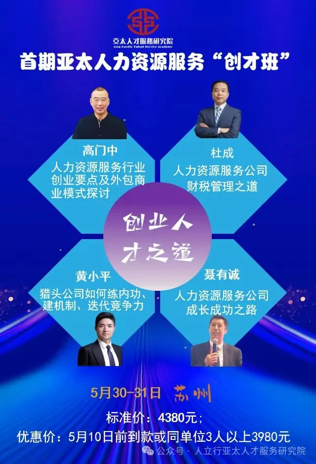 第一期人力资源服务公司创业人才班(简称“创才班”)和第二十二期人力资源服务机构外包业务“高才班”将于5月底在苏州举办,