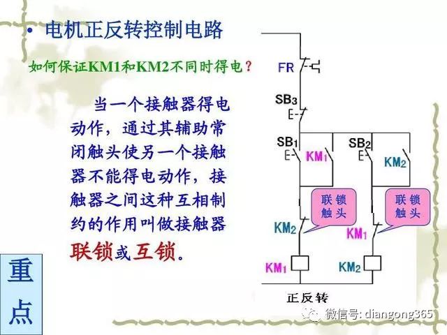 交流接触器KM1的常闭触点串联在交流接触器KM2线圈回路中,相应的,交流接触器KM2的常闭触点也串联在交流接触器KM1线圈回路中,说白了,这两个交流接触器不能同时工作。