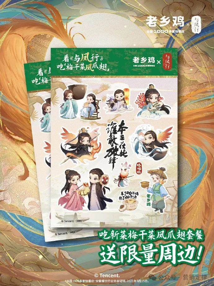 据悉,活动分两个阶段进行:4 月 8 日起,消费者到店购买「梅干菜凤爪翅」或在美团、饿了么、外卖小程序下单联名套餐即可获赠限量联名贴纸;4 月 22 日起,消费者在老乡鸡小程序下单联名套餐「咯咯哒单人餐」即可获赠联名挂件,下单「形影不璃双人餐」即可获赠联名折扇。同时,老乡鸡官微也与消费者频繁互动,在会员大结局之夜不仅发起抽奖活动还邀请大家一同吃「梅干菜凤爪翅」,看行影不璃,共赴「凤神之路」。