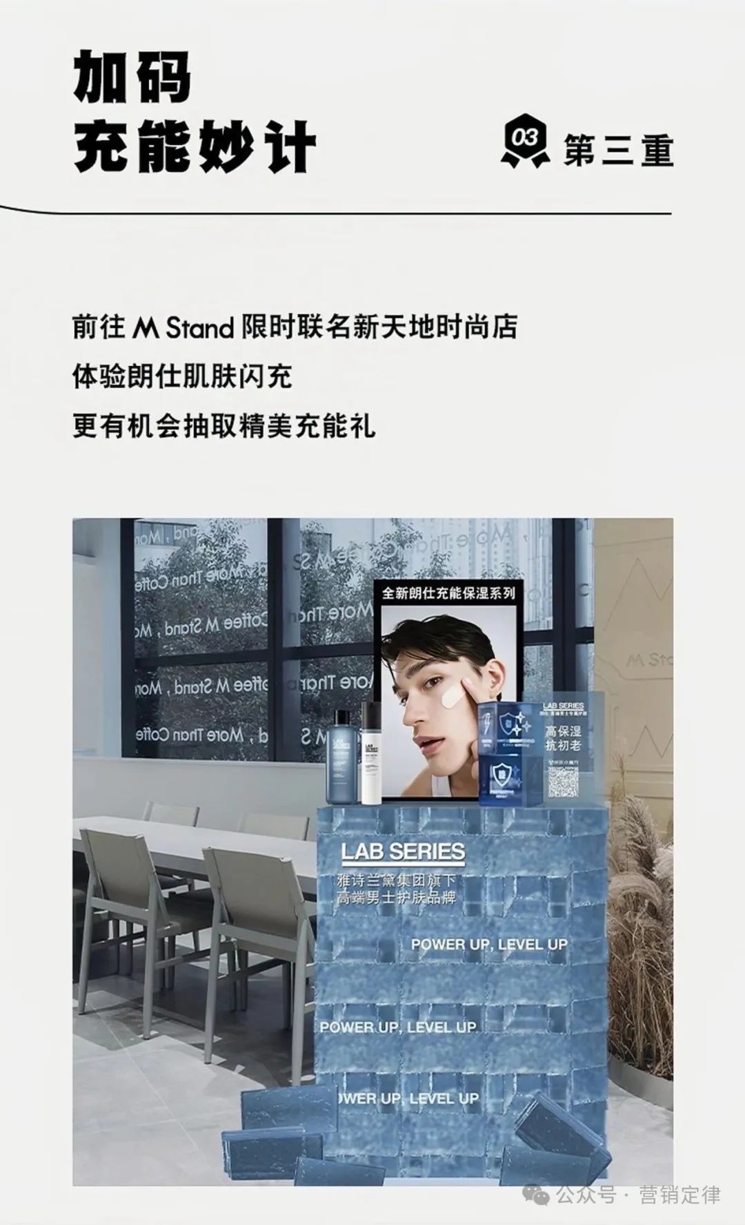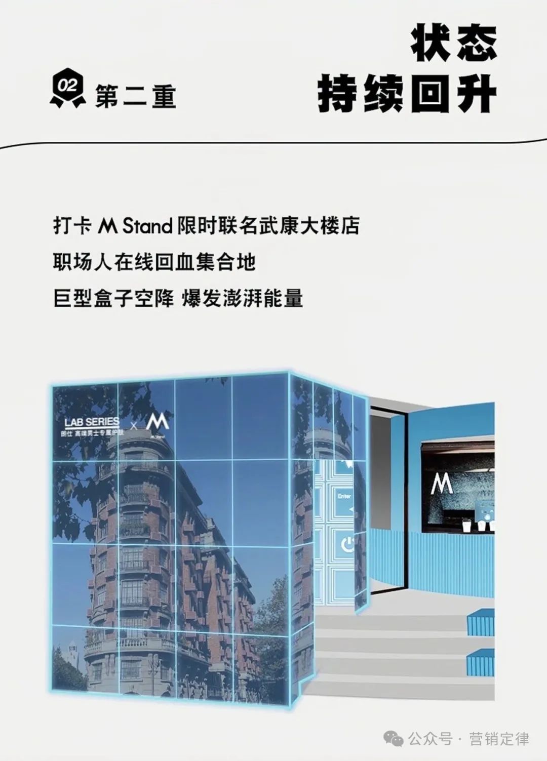 同时,二者共同打造两家 M Stand 联名主题店,武康大楼店中朗仕巨型盒子空降现场,为职场人提供在线回血集合地,新天地联名店则可现场体验朗仕充能保湿系列,更有机会抽取精美礼品。