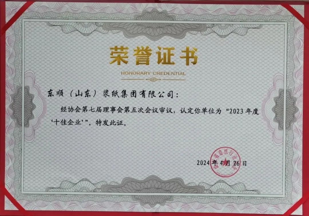 本次大会的主题是“绿色低碳、创新发展”,进一步推进山东省造纸产业绿色低碳高质量发展,总结行业运行成效,交流发展趋势,研讨产业发展新质生产力的途径模式,发布了造纸行业2023年发展报告,通报了全国及部分省市造纸行业现状和趋势。本次大会也是山东省工业和信息化厅“新轻纺 享生活”现代轻工纺织2024年活动。2023年,东顺集团坚定发展信心,聚焦浆纸主业,在规模效益、创新研发、环保节能、安全生产和履职尽责等工作中取得突出业绩,为产业链供应链稳定做出了重要贡献,荣膺山东省造纸行业“2023年度‘十佳企业’”。