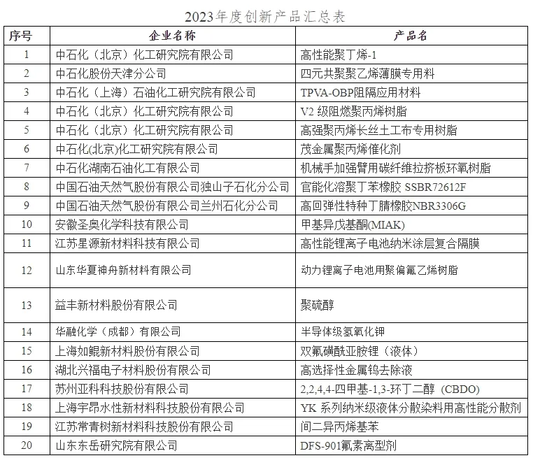 4月23日,在北京举办的2024石化产业发展大会上,中国石油和化学工业联合会发布《2023年度化工新材料创新产品》名单,有20项产品入选。