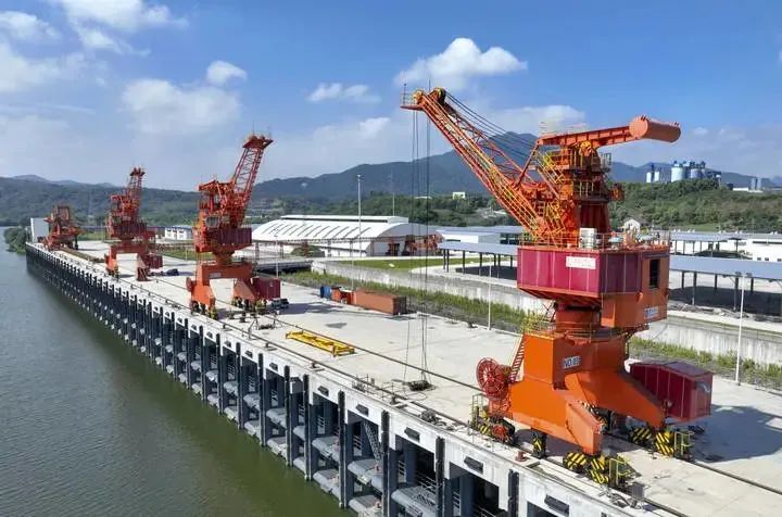 8月3日,新建成的绍兴港嵊州港区中心作业区码头吊机,在蓝天白云下格外醒目。