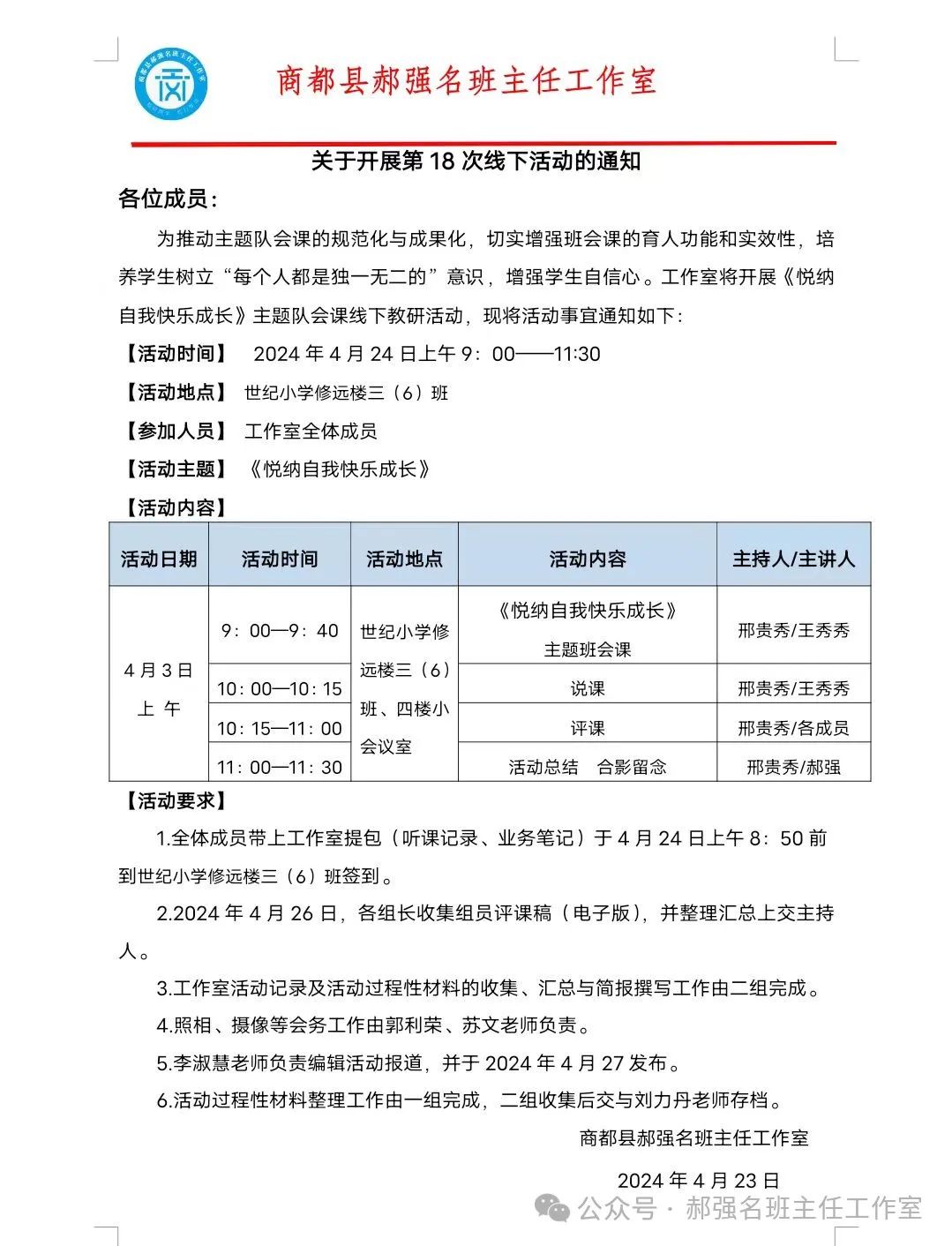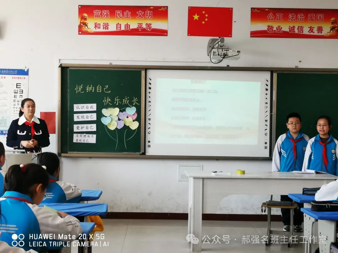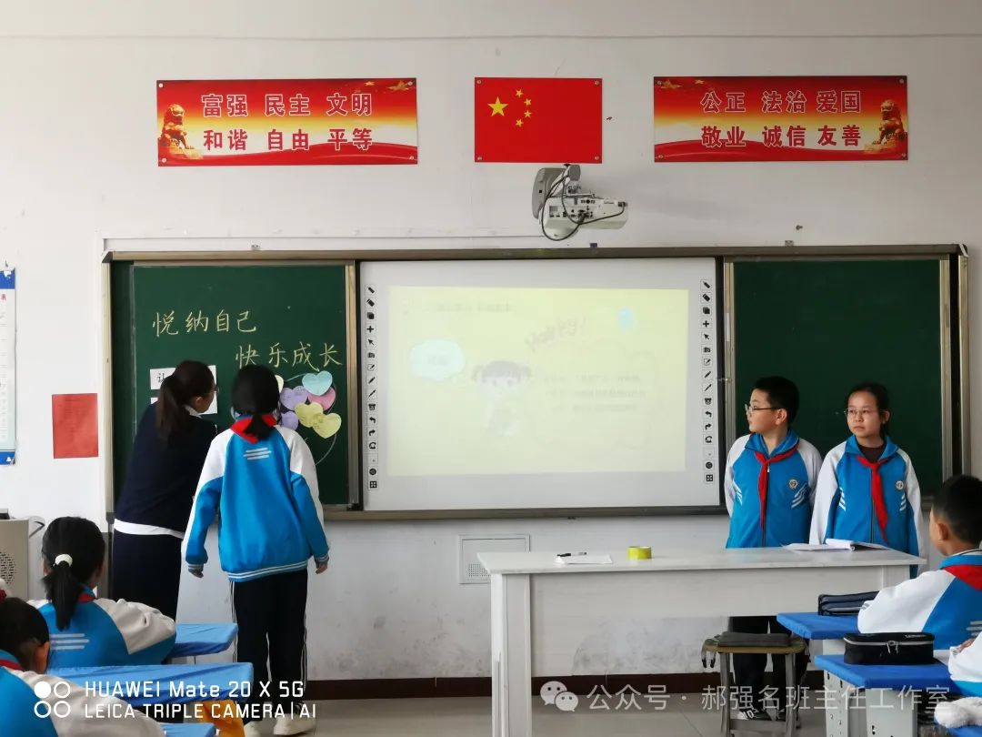 春日暖阳万物生,携手共进正当时。为进一步提高班主任组织队会能力,切实加强学生心理健康教育工作,促进小学生全面发展和健康成长,2024年4月23日,郝强名班主任工作室在世纪小学开展了题为《悦纳自己,快乐成长》的队会课教研活动。本次活动由王秀秀老师主讲,邢贵秀老师主持。