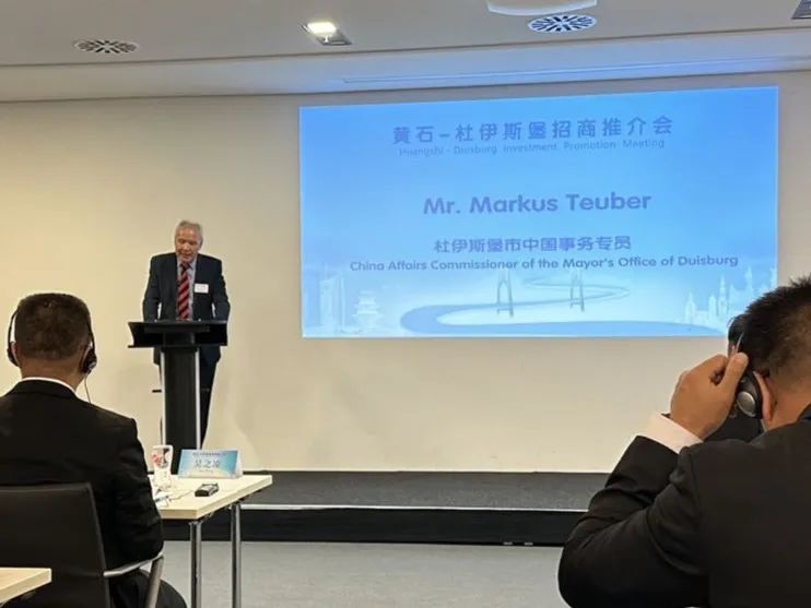 杜伊斯堡市中国事务专员陶逸泊(Markus Teuber)介绍了杜伊斯堡的地理优势和完善的产业链,赞扬自2014年中国国家主席习近平访问以来,中德企业间合作愈发紧密,对地区的经济、文化、教育发展产生了深远的积极影响。