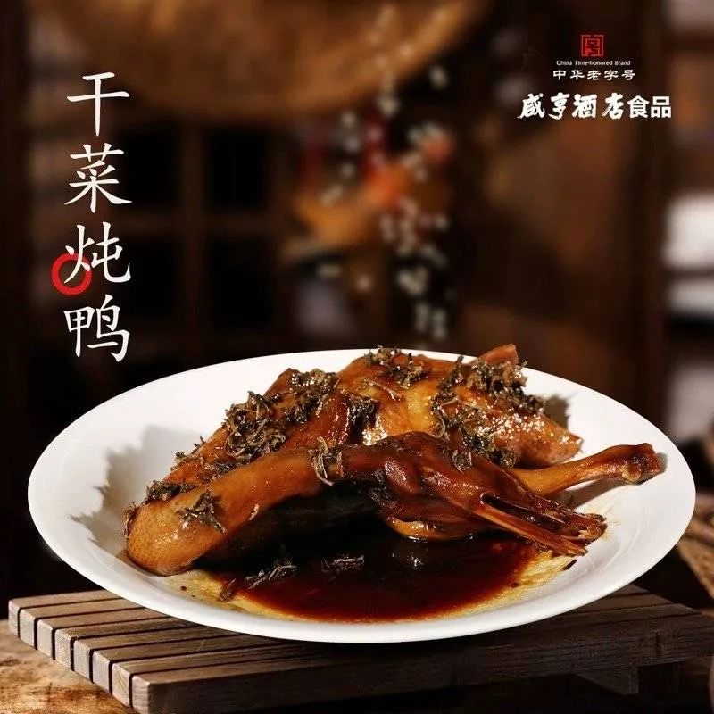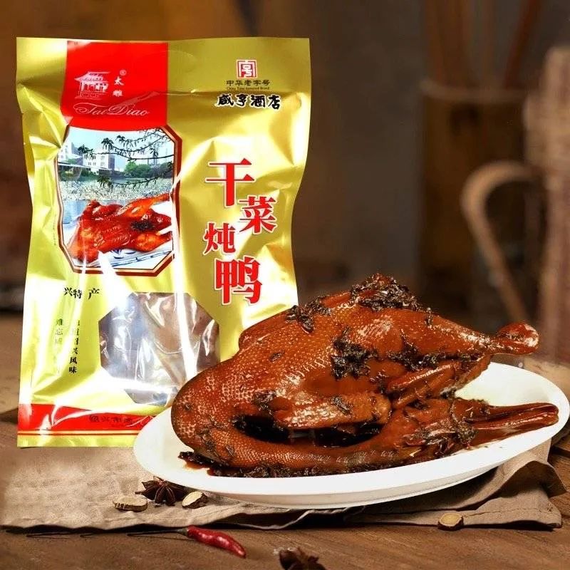 太雕干菜炖鸭,采用的干菜是由大叶芥加工而成,色泽暗黑,香气浓郁,味美质嫩,久贮不变。鸭子采用的是绍兴麻鸭,先腌后酱,肉色枣红,芳香油润,咸中带鲜,是绍兴传统的风味名菜。酱鸭皮黑肉嫩、醇厚不腻、香鲜美味,具有香辣麻酥嫩的特点,而且肉质筋道、鲜嫩诱人。