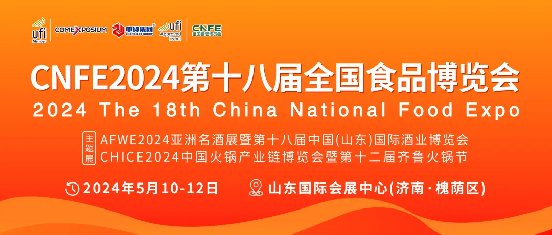 5月10日-12日,CNFE2024第十八届全国食品博览会将在济南市山东国际会展中心举办。【主题展:AFWE2024亚洲名酒展暨第十八届中国(山东)国际酒业博览会、CHICE2024中国火锅产业链博览会暨第十二届齐鲁火锅节】。