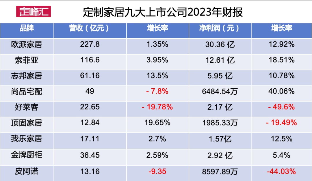 尚品宅配2023年度净利润约6485万元,同比增加40.06%4月27日发布年度业绩报告称,2023年营业收入约49亿元,同比减少7.8%;归属于上市公司股东的净利润约6485万元,同比增加40.06%。报告期末,公司直营门店数量为 46 家,自营城市加盟店数量为 285 家;公司加盟店数量为 2005 家(含自营加盟店,其中新开加盟店 463 家)。2024 年,公司将持续发展自营加盟,推出“9 城 500 店”的青年创业筑梦计划。欧派家居2023年营收227.82亿元,净利润30.36亿元4月24日,欧派家居发布2023年年度报告显示,报告期内公司实现营业收入227.82亿元,比上年同期增长1.35%;归属于上市公司股东的净利润为30.36亿元,比上年同期增长12.92%,细分来看,2023 年,工程渠道实现营业收入 35.86亿元,同比增长 2.6%;欧铂丽品牌实现营业收入 13.84 亿元,同比增长 2.8%;欧铂尼品牌实现营业收入 13.78 亿元,同比增长 2.4%;海外渠道实现营业收入 3.2 亿元,同比增长 46.5%。截止2023年末,公司共有8716家门店,其中欧派品牌门店6013家,欧铂丽1078家,欧铂尼1001家,铂尼思465家,其他品牌159家门店。申请开设欧派零售大家居的城市约 800 多个,零售大家居门店已经正常运营的城市约 600 多个。索菲亚2023年营收116.66亿元,净利润12.61亿元4月11日晚,索菲亚发布2023年年度报告。2023年,索菲亚深化“多品牌、全品类、全渠道”战略,实现营业收入116.66亿元,同比增长3.95%,归母净利润12.61亿元,同比增长18.51%。其中第四季度营业收入34.65亿元,同比增长5.37%。志邦家居2023年营收61.16亿元,净利润5.95亿元4月25日,志邦家居发布年度报告,2023年公司实现营业收入61.16亿元,比上年同期增长13.5%;归属于上市公司股东的净利润为5.95亿元,比上年同期增长10.76%。志邦家居经销业务渠道收入 31.24 亿元,占营业收入比重 51.08%,同比增长