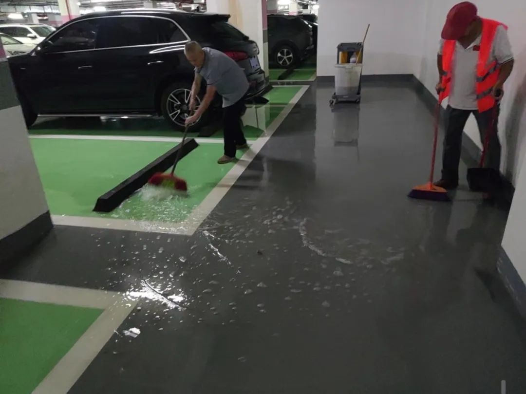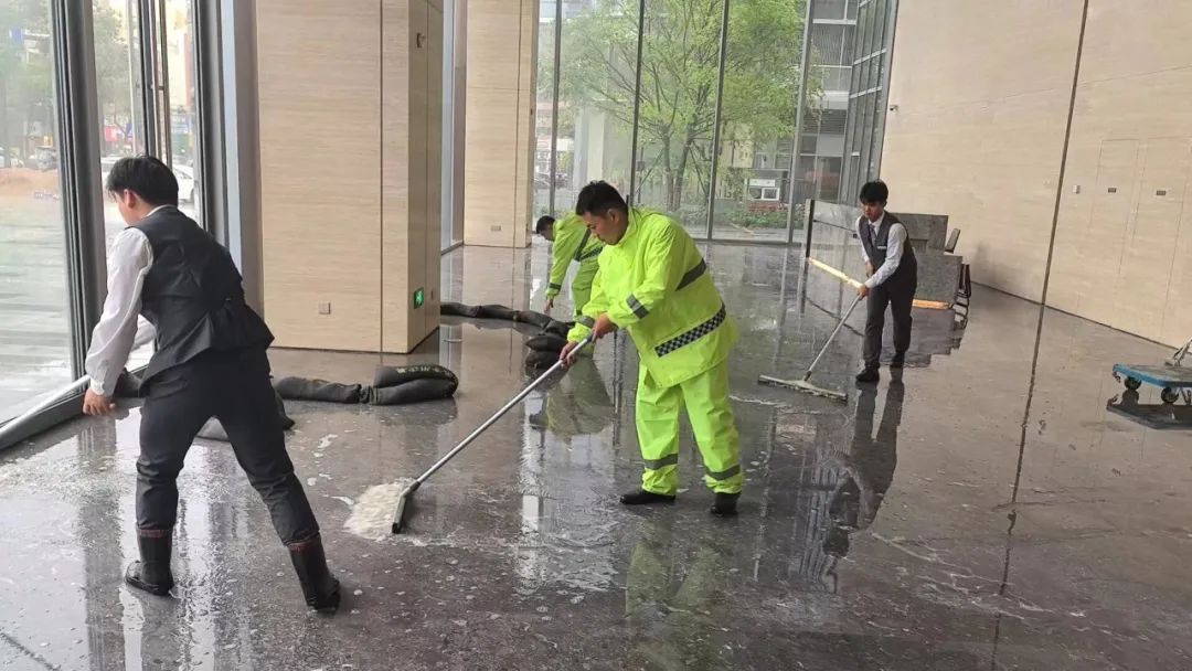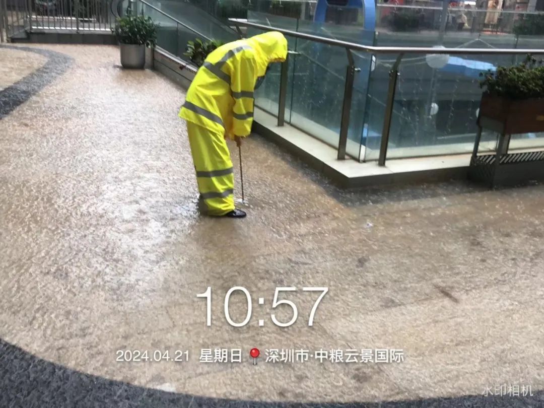 因雨量过大,深圳福田大悦中心、云景广场等项目部分大堂、车库存在不同程度积水现象,为保障人员正常行走,一线物业人及时清理积水。