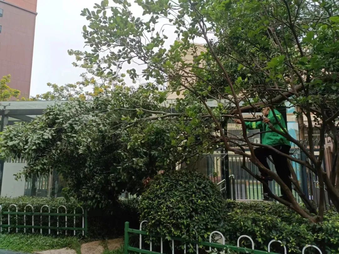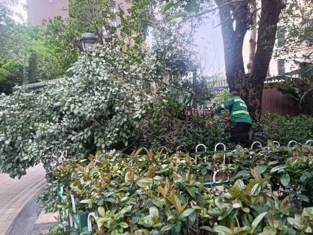 在深圳紫云花园、凤凰里花苑等项目,暴雨过后,绿化保洁人员第一时间对园区开展了一系列复原工作,清扫路面、装运垃圾……迅速而有序的开展暴雨过后的修复工作。