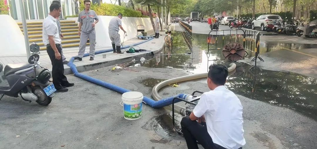 在三亚大悦中心等项目,秩序和工程工作人员第一时间清理积水、清理杂物,及时清理重要出入通道翻倒交通工具,保证雨中交通顺畅安全。