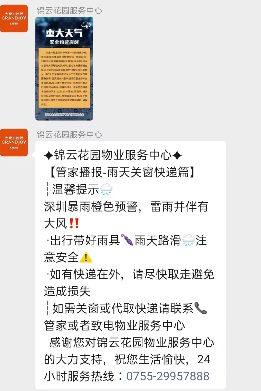 在深圳锦云花园、惠州珑悦锦云等项目,一线工作人员时刻关注官方信息,在业主群、朋友圈播报天气变化,发布防汛安全注意事项。并对园区楼层、空置房进行巡查,为其关好门窗,保障业主房屋不受暴雨损害。