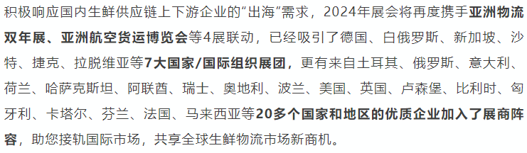 第十届亚洲生鲜供应链博览会(fresh logistics Asia,简称flA 2024)将于2024年6月25-27日在上海新国际博览中心举行。以“递送健康新生活”为主旨,展会将全面展示生鲜物流运输、末端配送、冷链信息化、冷库建设及仓储、生鲜食品加工包装、生鲜智能零售、预制菜供应链等产业链各端解决方案,集结前沿产品与优质服务,聚焦行业数智绿色升级,助力企业高效拓展业务,为中国生鲜物流产业发展注入“鲜”活驱动力。