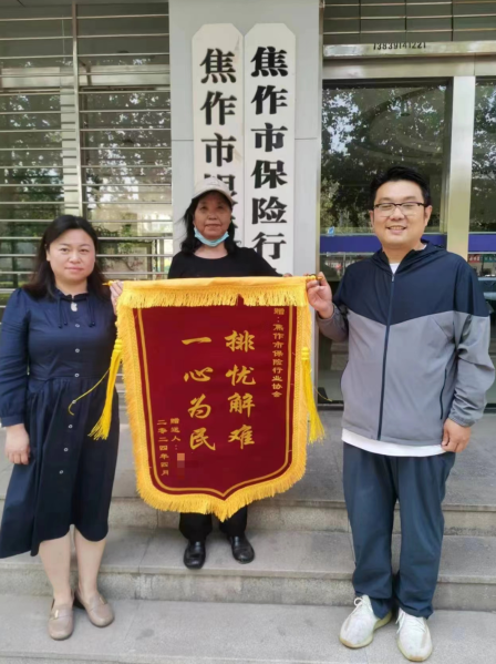 4月26日,王女士将一面绣着“排忧解难 一心为民”字样的锦旗送到焦作市保险行业协会调解中心,感谢中心帮助其和银行、保险公司达成调解协议,以专业高效的服务维护了金融消费者合法权益。