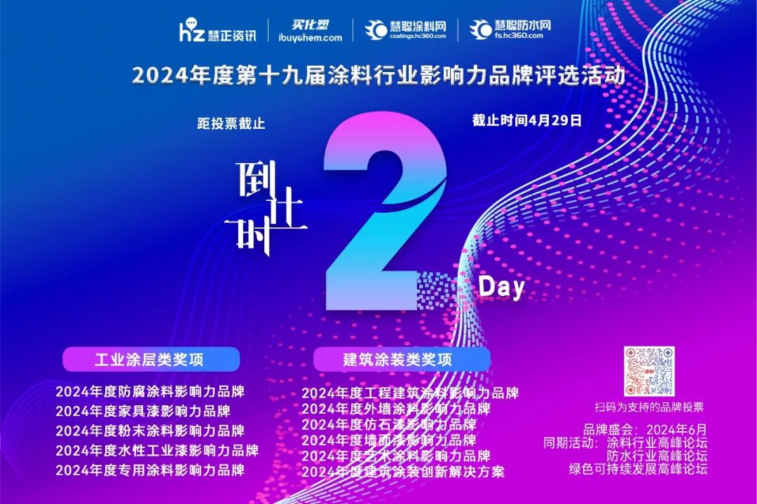 由买化塑、慧正资讯主办,慧聪涂料网联合主办的“2024年度涂料行业影响力品牌”投票活动将于明日截止。活动自4月9日开始投票以来,截止4月28日16:00,投票界面浏览量已达2,018,872人次,各奖项累计接受投票2,023,865次,目前票数还在持续增加。