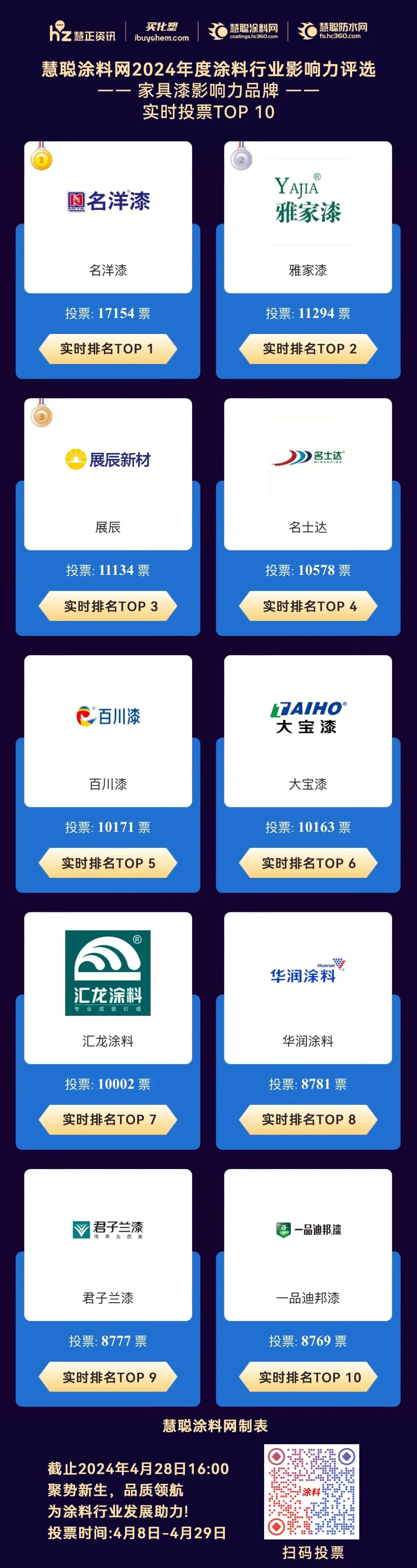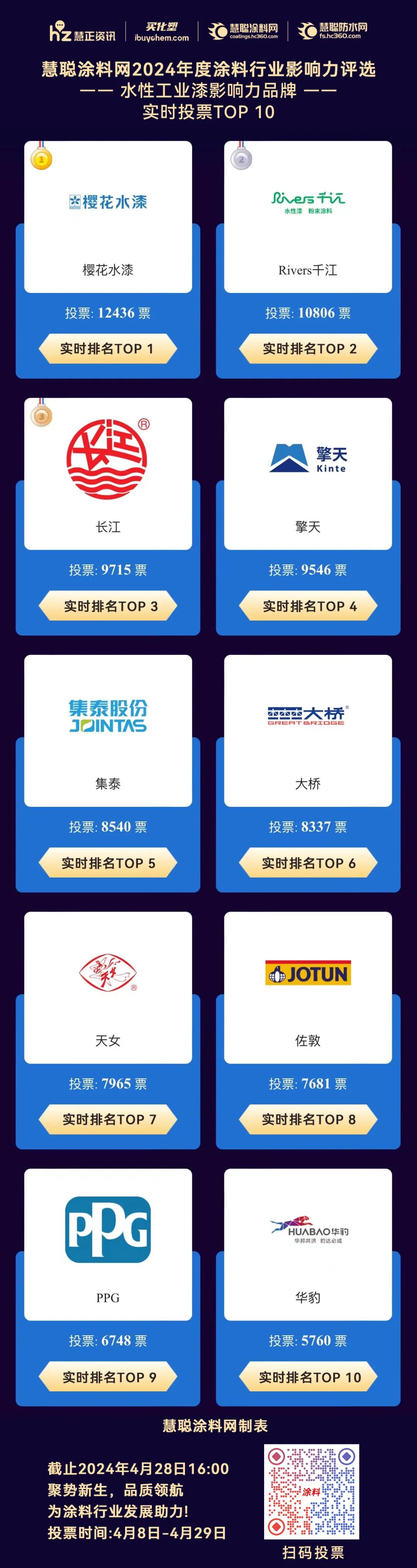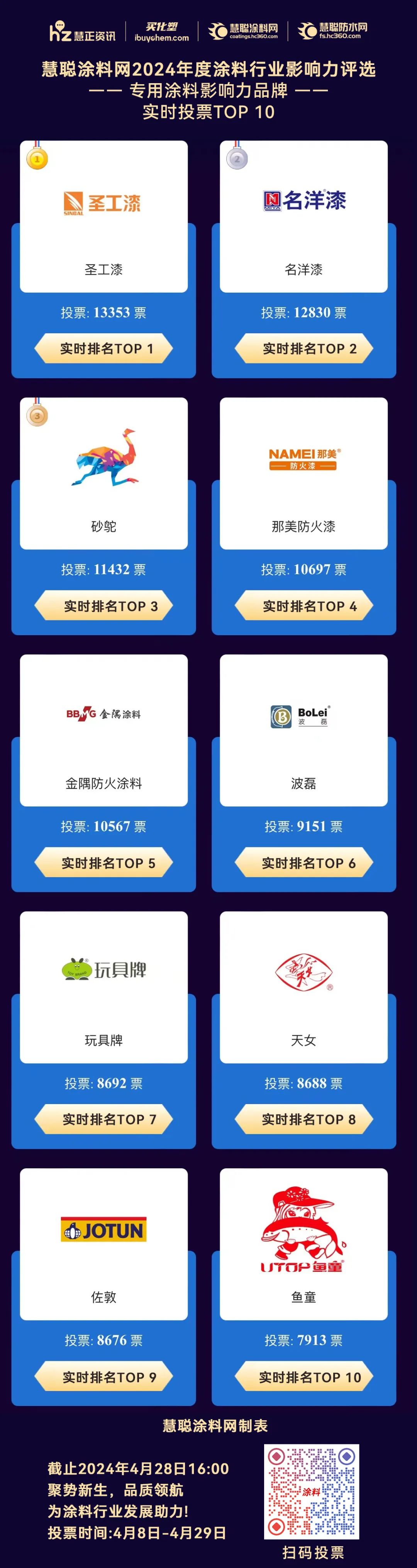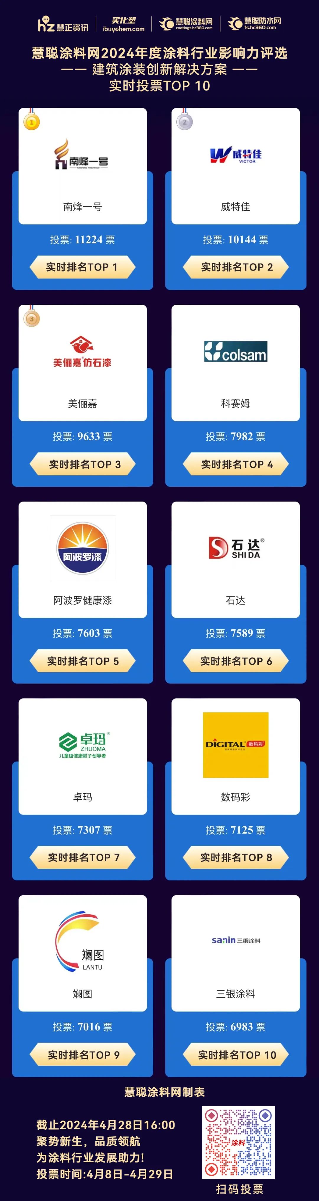 截止4月28日16:00,“2024年度第十九届涂料行业影响力品牌评选活动”各奖项投票排名前十的企业播报: